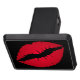 Rica huella de lápiz labial rojo de un beso. Fondo negro. Añadir un mensaje de texto personalizado.