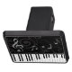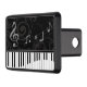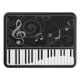 Un diseño musical caprichoso con llaves de teclado de piano y notas musicales curvadas sobre un modelo sutil del flourish en gris en un fondo negro. Ideal para el pianista, el estudiante del piano o el amante del piano.