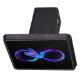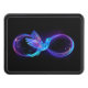 Símbolo de infinito violeta y brillante con colibrí azul sobre fondo negro. Neón.