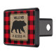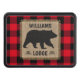 La cubierta rústica de este paso del remolque presenta un fondo rojo y negro de chupado de búfalo con un oso negro en el centro, en una plaza de frax burlap. Arriba tiene un nombre familiar para que usted personalice y debajo de la palabra "Lodge" con el año establecido. Diseñado por el artista de renombre mundial ©Tim Coffey.