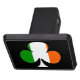 Las rayas verdes claras, anaranjadas, y blancas de la bandera de Irlanda llenan la forma tradicional del trébol. La imagen se pone en un fondo negro dramático. ¡Muestre orgulloso su lado irlandés!