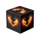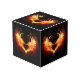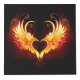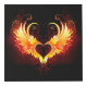Ángel dispara el corazón con las alas flameantes sobre fondo negro.