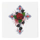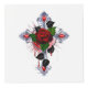 Cruz de plata con rosa roja y hojas negras sobre fondo blanco.
