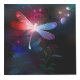 Flor, vuelo, libélula roja, con alas transparentes y detalladas sobre fondo oscuro, nocturno y luminoso con plantas tropicales y luciérnagas. Lluvia roja.