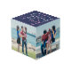 Cubo de fotos familiares con espacio para cuatro fotos cuadradas para celebrar a tu familia adoptiva. El amor hace un cubo de fotos familiar. Cubo de fotos de adopción en azul marino con diseño de tipografía rosa y blanca, y una flecha con un corazón rosado. Agrega el año en que te convertiste en una familia.