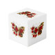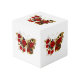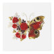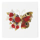 Mariposa de flores de los ojos de pavo real rojo con ala texturada roja, decorada con rosas rojos, pintados artistalmente con tallo dorado y hojas sobre fondo blanco.
