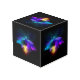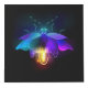 Luciérnagas mecánicas antiguas con bombilla de luz y finas alas brillan naranja, violeta, turquesa sobre fondo negro. Estilo Steampunk.