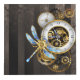 Diales antiguos con artes de oro y latón, decorados con libélula mecánica sobre fondo marrón, rayado. Steampunk.