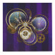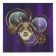 Araña de acero de oro y acero con relojes antiguos decorados con artes dorados sobre el fondo morado, rayado, texturado con lentes y engranajes de latón. Estilo Steampunk.