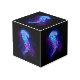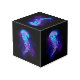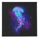 Gran medusa azul, de dibujo artístico, brillante y brillante, con largos tentáculos sobre fondo negro con bioluminiscencia violeta. Luminosas medusas.