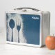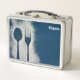 Cuchara y silueta de horquilla en un fondo azul - Texto editable