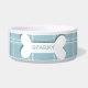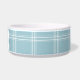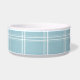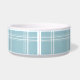 Este cuenco de cerámica de la comida de perro tiene un modelo azul y blanco de muy buen gusto de las rayas de la tela escocesa en el fondo. En el centro, hay un hueso blanco grande con un nombre fácilmente modificado para requisitos particulares de su perrito escrito en azul.