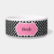 Plato elegante de la comida de perro hecho con una banda blanco y negro del lunar, alrededor del plato, y un área de texto decorativa rosada, en el centro para el su nombre de mascota. El texto de encargo negro de la diversión permite que usted modifique para requisitos particulares con el su nombre de mascota, porque un cuenco personalizado su perro puede ser orgulloso de. Hace una gran idea para un regalo.