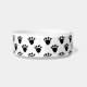 Este cuenco de cerámica de encargo del perro o del gato para su mascota tiene repetición de imágenes de impresiones negras de la pata por todo el plato. Forma un modelo geométrico blanco y negro del pawprint de la diversión.