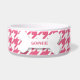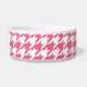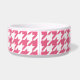 Este cuenco de cerámica de la comida de perro tiene un modelo rosado y blanco elegante del houndstooth en el fondo. En el centro, hay un hueso blanco grande con un nombre fácilmente modificado para requisitos particulares de su perrito escrito en rosa.