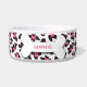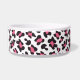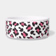 Este cuenco de cerámica de la comida de perro tiene un modelo negro, rosado y blanco elegante de la impresión del guepardo en el fondo. En el centro, hay un hueso blanco grande con un nombre fácilmente modificado para requisitos particulares de su perrito escrito en rosa.