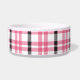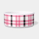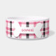 Este cuenco de cerámica de la comida de perro tiene un modelo negro, rosado y blanco elegante de la tela escocesa en el fondo. En el centro, hay un hueso blanco grande con un nombre fácilmente modificado para requisitos particulares de su perrito escrito en rosa.