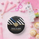Una gran manera de felicitar al nuevo jubilado o graduado por su retiro o graduación de la academia de policía. Este diseño incluye una bandera de la fuerza policial con rayas blancas y negras, y una delgada franja azul. Personalizar con el nombre del oficial de policía, sheriff, capitán o jefe que se retira o se gradúa. ¡Celebra este hito con estilo!