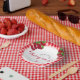 "Nuestra cereza en la cima" de otoño con el tema de la ducha para bebés con cerezas y manta de gingham roja.
