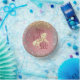 Un unicornio dorado y brillante en el que podrás personalizar tu evento sobre un fondo de color rosa coral con un fondo purpurinoso dorado y plateado que te permite disfrutar de magia extra. Vibes mágicas caprichosas.