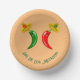 Este impresionante tazón de papel fiesta incluye un par de ají, un chile rojo y un chile verde. Ambos tienen ojos negros y bocas rosas. Cada chile lleva un gorra con sombrero que tiene un cráneo de color opuesto al ají en celebración del Día de los Muertos en México, Día de los Muertos. El sombrero también contiene tres flores con pétalos rojos y verdes alternados que representan la bandera de México. Hay texto personalizado para que pueda incluir un mensaje.