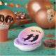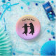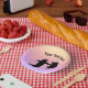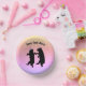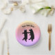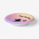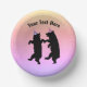 Este tazón de papel tiene dos osos negros bailarines felices con gorras fiestas rayados rosados y violetas con fondo amarillo, rosa melocotón y morado en color pastel. Personalizar el texto con la plantilla.