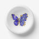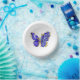 Joyería, azul, zafiro, mariposa floral brillante con ala decorada con flores azules y preciosas con hojas de oro sobre fondo blanco.