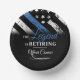 Este diseño presenta una bandera de la fuerza policial con franjas negras y blancas, y una franja de línea azul fina también. El texto "La leyenda se jubila" se sitúa encima del nombre personalizable del oficial de policía, alguacil, capitán o jefe que se jubila. ¡Celebre este hito con estilo!