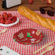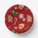 Los festivos cuencos de papel de los Navidades Rojos que incluyen copos de nieve, latas de dulces, galletas de jengibre, arcos y medias de Navidades.