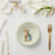 Peter el conejo recogiendo verduras con un fondo de rayas de salvia verde y crema Primer cumpleaños saludo