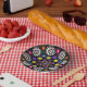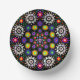 Placa de papel de mandala dibujada a mano negra, amarilla, azul y púrpura.