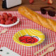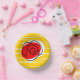 Diseño de mediados de siglo, de estilo retro, con un recuerdo de rosa rojo de una fiesta española con esquinas giratorias sobre un fondo de rayas doradas amarillas y blancas. Un diseño de personalizable en blanco, negro, rojo y amarillo para que puedas personalizar con tu propio texto, imágenes e ideas. Imagen original de arte digital.