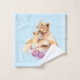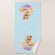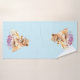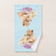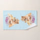 Toalla puesta con una linda pintura acuarela de un león madre sosteniendo su cachorro de bebé. Un ramo de flores moradas de bonito debajo de ellas aporta un toque agradable a esta imagen dulce y adorable. Fondo azul claro.