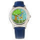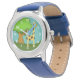 Dibujo de una jirafa colorida sobre un reloj de niños con correa de cuero disponible en varios colores para niños o chicas.