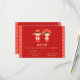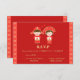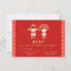 Una tarjeta RSVP a la encantadora invitación tradicional a una boda china. El diseño tiene un lindo personalizado de recién casados, el novio y la novia con un brillante traje rojo y oro falso auspicioso. El borde es un patrón hecho usando los caracteres chinos. Significa doble felicidad que se usa para la felicidad conyugal. Personalice su mensaje RSVP con caracteres chinos.
