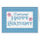 Tarjeta de cumpleaños 70 bonito, con un patrón de gingham azul y blanco y dos flores rosadas. Puedes cambiar el saludo interno si lo deseas.