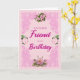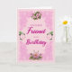 Una tarjeta de bonito para un amigo. Una elegante tracería en conjuntos rosados de las cuatro rosas rosas. El fondo es un estampado de flores rosa pálido. Una tarjeta encantadora para enviarle a una amiga en su cumpleaños.
