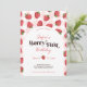 Esta invitación de cumpleaños número uno "Strawberry Berry First" presenta un bonito patrón de fresas rojas sobre un fondo de gingham rosa claro y preciosas margaritas. Es perfecta y hermosa para una celebración de cumpleaños número uno con tema de fresas de verano para niñas.