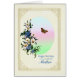 Una hermosa tarjeta de cumpleaños floral para una madre. Un bonito ramo de flores azules y blancas con una mariposa marrón en vuelo. El cuadro tiene un delicado marco dorado.