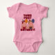 Camisetas gemelas de primer cumpleaños, trajes-bodyastos, tarjetas, posters, keepsakes y más presentando gemelos chicas en gorras fiestas y arcos de peinado, globos y texto que dice "¡Primeros cumpleaños!".
