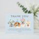 Tarjeta de agradecimiento linda para enviar después de la fiesta de cumpleaños con tema de perritos de su hijo. Esta tarjeta ya tiene texto que puede usar tal como está o editar fácilmente en línea. Ilustración de 4 perros (dálmata, beagle, terrier pit bull) con sombreros de fiesta con el texto "gracias" encima de ellos.
