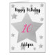 Tarjeta chica de cumpleaños personalizada que presenta estrellas plateadas esparcidas por el frente. Usted puede fácilmente personalizar la gran estrella plateada con su edad de cumpleaños y nombre debajo de la estrella. El mensaje de la tarjeta interior dice "¡Para un chica que brilla y brilla como ningún otro! ¡Feliz cumpleaños!" también puede ser fácilmente personalizado si lo desea. La parte trasera de la tarjeta de cumpleaños personalizada dice Feliz cumpleaños 2018.