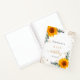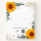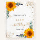 Un color de fondo blanco. Decorada con girasoles, vegetación eucalipto, follaje dorado y polvo falso purpurina de oro. Añadir un nombre, edad y fecha.