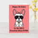Frenchies, muéstrale a tu mamá algún amor por su cumpleaños con una tarjeta personalizada sólo de ti. El mensaje en la parte delantera de la tarjeta dice "¡Feliz cumpleaños a la mejor mamá francesa de todos los tiempos!" El mensaje interior dice: "Te amo más que los dulces, Feliz cumpleaños". El diseño presenta un bonito ilustracion de estilo personalizado de un bulldog francés de color blanco con un arco y un collar rosados. Color de fuente y fondo y se debe cambiar seleccionando "Haga clic en el personalizar más adelante".