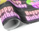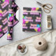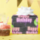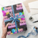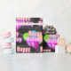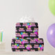 Signo de neón rosa feliz de cumpleaños con un ramo de globo en un patrón de ladrillo negro
