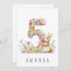 Haz que el quinto cumpleaños de un pequeño sea aún más especial con esta encantadora tarjeta, que presenta una delicada ilustración de acuarela del número 5, bellamente elaborada con diminutas y coloridas flores pastel. Un conejito lindo se para junto al número, mordisqueando juguetonamente las flores, agregando un toque de dulzura y alegría al diseño. Ya seas un padre, abuelo o amigo de la familia, esta encantadora tarjeta seguramente traerá una sonrisa tanto al pequeño como a sus seres queridos.