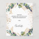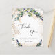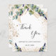 Una tarjeta de agradecimiento por un cumpleaños número 50 (o cualquier edad). Un fondo blanco de moda decorado con vegetación eucalipto y un polvo falso purpurina dorado. En el frente, gran guión escrito a mano de color negro y el texto: Gracias, tu texto, título y una fecha. Atrás: Personaliza y agrega tu nota de agradecimiento y nombre.