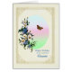 Una hermosa tarjeta de cumpleaños floral para un primo. Un bonito ramo de flores azules y blancas con una mariposa marrón en vuelo. El cuadro tiene un delicado marco dorado.
