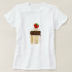 Una mujer blanca, con espagueti, se ataca con un motivo de quequito. El quequito de fresa y colocado con crema es de un diseño de collage de papel pintado a mano por Judy Adamson.