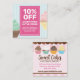 Una gran tarjeta de cupón para repartir a los clientes, ofertas especiales para poner en venta bolsas para eventos y otras formas de anunciar su venta y llevar más clientes a su tienda de cupcakes física o online. Orientado a panaderías que venden pasteles con un diseño divertido y caprichoso con pastelitos de diferentes sabores con rociadores, chocolate, vainilla y terciopelo rojo en los principales colores de marrón y rosa. La tarjeta le permite introducir su porcentaje de venta, términos y condiciones y añadir su información comercial.